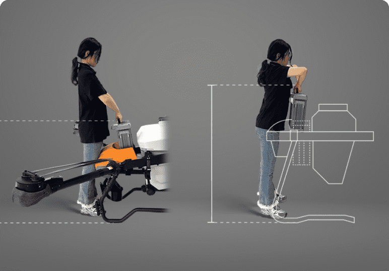 Hitri polnilec z močjo do 9000W omogoča hitro polnjenje baterij in minimizira izpad časa med operacijami. Opcijska konfiguracija z več baterijami omogoča celodnevno neprekinjeno delo.